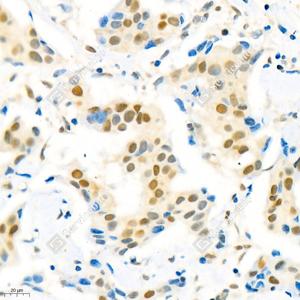 IHC检测KMT1B/SUV39H2蛋白(货号 GB111054). 样品: 人乳腺癌, 4%多聚甲醛 (货号G1101) 固定12-24小时. 抗原修复: 柠檬酸抗原修复液(干粉, pH 6.0) (G1201), 98℃, 20分钟. —抗: 1: 2000稀释, 4℃ 孵育过夜. 二抗: HRP标记山羊抗兔IgG (H+L) (货号GB23303), 1: 200稀释, 室温孵育1小时. |