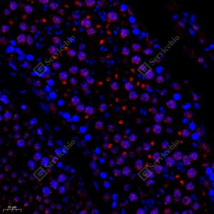 IF检测KMT1B/SUV39H2蛋白(货号 GB111054)(红色). 样品: 大鼠睾丸, 4%多聚甲醛 (货号G1101) 固定12-24小时. 抗原修复: Tris-EDTA抗原修复液(pH 9.0) (G1203), 98℃, 20分钟. 封闭: 3% BSA(货号GC305010)的PBS溶液, 室温孵育30分钟. —抗: 1: 2000稀释, 4℃ 孵育过夜. 二抗: Cy3标记山羊抗兔IgG (H+L) (货号GB21303), 1: 300稀释, 室温孵育1小时. |