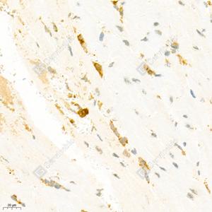 IHC检测KMT3C/SMYD2蛋白(货号 GB111583). 样品: 小鼠心, 4%多聚甲醛 (货号G1101) 固定12-24小时. 抗原修复: 柠檬酸抗原修复液(干粉, pH 6.0) (G1201), 98℃, 20分钟. —抗: 1: 2000稀释, 4℃ 孵育过夜. 二抗: HRP标记山羊抗兔IgG (H+L) (货号GB23303), 1: 200稀释, 室温孵育1小时. |