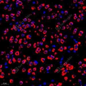 IF检测KMT3C/SMYD2蛋白(货号 GB111583)(红色). 样品: 大鼠骨纤维瘤, 4%多聚甲醛 (货号G1101) 固定12-24小时. 抗原修复: Tris-EDTA抗原修复液(pH 9.0) (G1203), 98℃, 20分钟. 封闭: 3% BSA(货号GC305010)的PBS溶液, 室温孵育30分钟. —抗: 1: 2000稀释, 4℃ 孵育过夜. 二抗: Cy3标记山羊抗兔IgG (H+L) (货号GB21303), 1: 300稀释, 室温孵育1小时. |