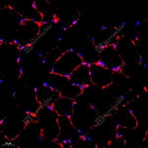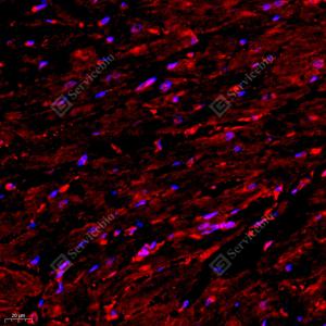 IF检测KMT3C/SMYD2蛋白(货号 GB111583)(红色). 样品: 大鼠心, 4%多聚甲醛 (货号G1101) 固定12-24小时. 抗原修复: Tris-EDTA抗原修复液(pH 9.0) (G1203), 98℃, 20分钟. 封闭: 3% BSA(货号GC305010)的PBS溶液, 室温孵育30分钟. —抗: 1: 2000稀释, 4℃ 孵育过夜. 二抗: Cy3标记山羊抗兔IgG (H+L) (货号GB21303), 1: 300稀释, 室温孵育1小时. |