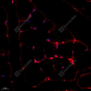 IF检测KMT3C/SMYD2蛋白(货号 GB111583)(红色). 样品: 小鼠骨骼肌, 4%多聚甲醛 (货号G1101) 固定12-24小时. 抗原修复: Tris-EDTA抗原修复液(pH 9.0) (G1203), 98℃, 20分钟. 封闭: 3% BSA(货号GC305010)的PBS溶液, 室温孵育30分钟. —抗: 1: 1000稀释, 4℃ 孵育过夜. 二抗: Cy3标记山羊抗兔IgG (H+L) (货号GB21303), 1: 300稀释, 室温孵育1小时. |