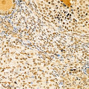 IHC检测SRC3蛋白(货号 GB111066). 样品: 小鼠卵巢, 4%多聚甲醛 (货号G1101) 固定12-24小时. 抗原修复: 柠檬酸抗原修复液(干粉, pH 6.0) (G1201), 98℃, 20分钟. —抗: 1: 1000稀释, 4℃ 孵育过夜. 二抗: HRP标记山羊抗兔IgG (H+L) (货号GB23303), 1: 200稀释, 室温孵育1小时. |