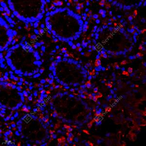 IF检测SRC3蛋白(货号 GB111066)(红色). 样品: 人结肠, 4%多聚甲醛 (货号G1101) 固定12-24小时. 抗原修复: Tris-EDTA抗原修复液(pH 9.0) (G1203), 98℃, 20分钟. 封闭: 3% BSA(货号GC305010)的PBS溶液, 室温孵育30分钟. —抗: 1: 2000稀释, 4℃ 孵育过夜. 二抗: Cy3标记山羊抗兔IgG (H+L) (货号GB21303), 1: 300稀释, 室温孵育1小时. |
