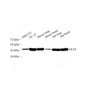 WB检测Glutamine Synthetase蛋白(货号 GB111177). 样品: 经RIPA裂解液(货号G2002)处理的蛋白质. 封闭: 封闭: 3%脱脂牛奶(货号GC310001)溶于TBST溶液, 室温孵育1小时. —抗: 1: 500稀释, 4℃ 孵育过夜. 二抗: HRP标记山羊抗兔IgG (H+L) (货号GB23303), 1: 5000稀释, 室温孵育1小时. |