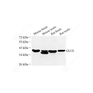 WB检测Glutamine Synthetase蛋白(货号 GB111217). 样品: 经RIPA裂解液(货号G2002)处理的蛋白质. 封闭: 封闭: 3%脱脂牛奶(货号GC310001)溶于TBST溶液, 室温孵育1小时. —抗: 1: 500稀释, 4℃ 孵育过夜. 二抗: HRP标记山羊抗兔IgG (H+L) (货号GB23303), 1: 5000稀释, 室温孵育1小时. |