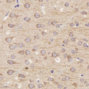 IHC检测Choline Acetyltransferase蛋白(货号 GB11070-1). 样品: 小鼠脑, 4%多聚甲醛 (货号G1101) 固定12-24小时. 抗原修复: 柠檬酸抗原修复液(干粉, pH 6.0) (G1201), 98℃, 20分钟. —抗: 1: 1000稀释, 4℃ 孵育过夜. 二抗: HRP标记山羊抗兔IgG (H+L) (货号GB23303), 1: 200稀释, 室温孵育1小时. |