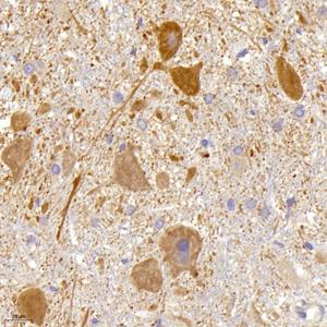 IHC检测Choline Acetyltransferase蛋白(货号 GB11070-1). 样品: 大鼠脑, 4%多聚甲醛 (货号G1101) 固定12-24小时. 抗原修复: 柠檬酸抗原修复液(干粉, pH 6.0) (G1201), 98℃, 20分钟. —抗: 1: 1000稀释, 4℃ 孵育过夜. 二抗: HRP标记山羊抗兔IgG (H+L) (货号GB23303), 1: 200稀释, 室温孵育1小时. |