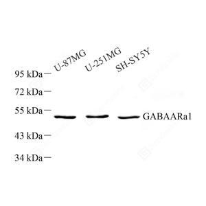 WB检测GABA A Receptor alpha 1蛋白(货号 GB11561). 样品: 经RIPA裂解液(货号G2002)处理的蛋白质. 封闭: 封闭: 3%脱脂牛奶(货号GC310001)溶于TBST溶液, 室温孵育1小时. —抗: 1: 500稀释, 4℃ 孵育过夜. 二抗: HRP标记山羊抗兔IgG (H+L) (货号GB23303), 1: 5000稀释, 室温孵育1小时. |