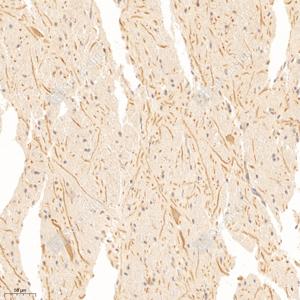 IHC检测GABA A Receptor alpha 1蛋白(货号 GB11716). 样品: 人脑, 4%多聚甲醛 (货号G1101) 固定12-24小时. 抗原修复: 柠檬酸抗原修复液(干粉, pH 6.0) (G1201), 98℃, 20分钟. —抗: 1: 300稀释, 4℃ 孵育过夜. 二抗: HRP标记山羊抗兔IgG (H+L) (货号GB23303), 1: 200稀释, 室温孵育1小时. |
