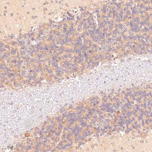 IHC检测GABA A Receptor alpha 1蛋白(货号 GB11716). 样品: 小鼠小脑, 4%多聚甲醛 (货号G1101) 固定12-24小时. 抗原修复: 柠檬酸抗原修复液(干粉, pH 6.0) (G1201), 98℃, 20分钟. —抗: 1: 300稀释, 4℃ 孵育过夜. 二抗: HRP标记山羊抗兔IgG (H+L) (货号GB23303), 1: 200稀释, 室温孵育1小时. |
