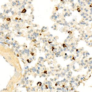 IHC检测GABA A Receptor alpha 1蛋白(货号 GB11716). 样品: 小鼠肺, 4%多聚甲醛 (货号G1101) 固定12-24小时. 抗原修复: 柠檬酸抗原修复液(干粉, pH 6.0) (G1201), 98℃, 20分钟. —抗: 1: 600稀释, 4℃ 孵育过夜. 二抗: HRP标记山羊抗兔IgG (H+L) (货号GB23303), 1: 200稀释, 室温孵育1小时. |