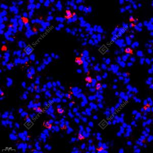 IF检测GABA A Receptor alpha 1蛋白(货号 GB11716)(红色). 样品: 小鼠肺, 4%多聚甲醛 (货号G1101) 固定12-24小时. 抗原修复: Tris-EDTA抗原修复液(pH 9.0) (G1203), 98℃, 20分钟. 封闭: 3% BSA(货号GC305010)的PBS溶液, 室温孵育30分钟. —抗: 1: 600稀释, 4℃ 孵育过夜. 二抗: Cy3标记山羊抗兔IgG (H+L) (货号GB21303), 1: 300稀释, 室温孵育1小时. |