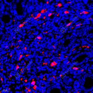 IF检测GABA A Receptor alpha 1蛋白(货号 GB11716)(红色). 样品: 小鼠子宫, 4%多聚甲醛 (货号G1101) 固定12-24小时. 抗原修复: Tris-EDTA抗原修复液(pH 9.0) (G1203), 98℃, 20分钟. 封闭: 3% BSA(货号GC305010)的PBS溶液, 室温孵育30分钟. —抗: 1: 600稀释, 4℃ 孵育过夜. 二抗: Cy3标记山羊抗兔IgG (H+L) (货号GB21303), 1: 300稀释, 室温孵育1小时. |
