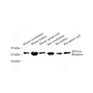 WB检测5HT1A Receptor蛋白(货号 GB11887). 样品: 经RIPA裂解液(货号G2002)处理的蛋白质. 封闭: 封闭: 3%脱脂牛奶(货号GC310001)溶于TBST溶液, 室温孵育1小时. —抗: 1: 500稀释, 4℃ 孵育过夜. 二抗: HRP标记山羊抗兔IgG (H+L) (货号GB23303), 1: 5000稀释, 室温孵育1小时. |