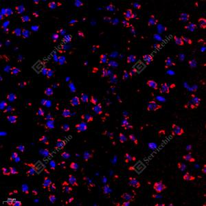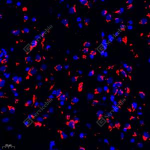 IF检测NMDAR2B蛋白(货号 GB11381)(红色). 样品: 小鼠脑, 4%多聚甲醛 (货号G1101) 固定12-24小时. 抗原修复: Tris-EDTA抗原修复液(pH 9.0) (G1203), 98℃, 20分钟. 封闭: 3% BSA(货号GC305010)的PBS溶液, 室温孵育30分钟. —抗: 1: 400稀释, 4℃ 孵育过夜. 二抗: Cy3标记山羊抗兔IgG (H+L) (货号GB21303), 1: 300稀释, 室温孵育1小时. |