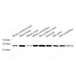WB检测5HT2A Receptor蛋白(货号 GB111001). 样品: 经RIPA裂解液(货号G2002)处理的蛋白质. 封闭: 3%脱脂牛奶(货号GC310001)溶于TBST溶液, 室温孵育1小时. —抗: 1: 1000稀释, 4℃ 孵育过夜. 二抗: HRP标记山羊抗兔IgG (H+L) (货号GB23303), 1: 5000稀释, 室温孵育1小时. |