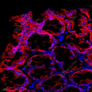 IF检测5HT2A Receptor蛋白(货号 GB111001)(红色). 样品: 人结肠, 4%多聚甲醛 (货号G1101) 固定12-24小时. 抗原修复: Tris-EDTA抗原修复液(pH 9.0) (G1203), 98℃, 20分钟. 封闭: 3% BSA(货号GC305010)的PBS溶液, 室温孵育30分钟. —抗: 1: 2000稀释, 4℃ 孵育过夜. 二抗: Cy3标记山羊抗兔IgG (H+L) (货号GB21303), 1: 300稀释, 室温孵育1小时. |