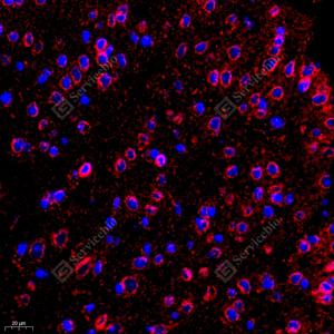 IF检测5HT2A Receptor蛋白(货号 GB111001)(红色). 样品: 小鼠脑, 4%多聚甲醛 (货号G1101) 固定12-24小时. 抗原修复: Tris-EDTA抗原修复液(pH 9.0) (G1203), 98℃, 20分钟. 封闭: 3% BSA(货号GC305010)的PBS溶液, 室温孵育30分钟. —抗: 1: 2000稀释, 4℃ 孵育过夜. 二抗: Cy3标记山羊抗兔IgG (H+L) (货号GB21303), 1: 300稀释, 室温孵育1小时. |