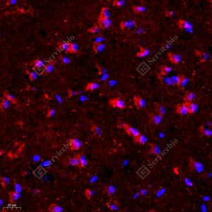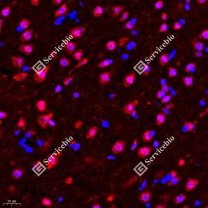 IF检测NMDAR1蛋白(货号 GB11144)(红色). 样品: 小鼠脑梗塞, 4%多聚甲醛 (货号G1101) 固定12-24小时. 抗原修复: Tris-EDTA抗原修复液(pH 9.0) (G1203), 98℃, 20分钟. 封闭: 3% BSA(货号GC305010)的PBS溶液, 室温孵育30分钟. —抗: 1: 100稀释, 4℃ 孵育过夜. 二抗: Cy3标记山羊抗兔IgG (H+L) (货号GB21303), 1: 300稀释, 室温孵育1小时. |