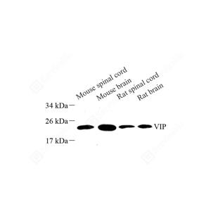 WB检测VIP蛋白(货号 GB11279). 样品: 经RIPA裂解液(货号G2002)处理的蛋白质. 封闭: 封闭: 3%脱脂牛奶(货号GC310001)溶于TBST溶液, 室温孵育1小时. —抗: 1: 500稀释, 4℃ 孵育过夜. 二抗: HRP标记山羊抗兔IgG (H+L) (货号GB23303), 1: 5000稀释, 室温孵育1小时. |