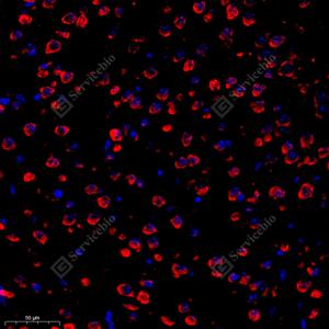 IF检测Ionotropic Glutamate receptor 2蛋白(货号 GB111578)(红色). 样品: 小鼠脑, 4%多聚甲醛 (货号G1101) 固定12-24小时. 抗原修复: Tris-EDTA抗原修复液(pH 9.0) (G1203), 98℃, 20分钟. 封闭: 3% BSA(货号GC305010)的PBS溶液, 室温孵育30分钟. —抗: 1: 1000稀释, 4℃ 孵育过夜. 二抗: Cy3标记山羊抗兔IgG (H+L) (货号GB21303), 1: 300稀释, 室温孵育1小时. |