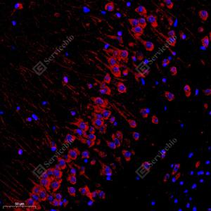 IF检测Ionotropic Glutamate receptor 2蛋白(货号 GB111578)(红色). 样品: 大鼠脑, 4%多聚甲醛 (货号G1101) 固定12-24小时. 抗原修复: Tris-EDTA抗原修复液(pH 9.0) (G1203), 98℃, 20分钟. 封闭: 3% BSA(货号GC305010)的PBS溶液, 室温孵育30分钟. —抗: 1: 1000稀释, 4℃ 孵育过夜. 二抗: Cy3标记山羊抗兔IgG (H+L) (货号GB21303), 1: 300稀释, 室温孵育1小时. |