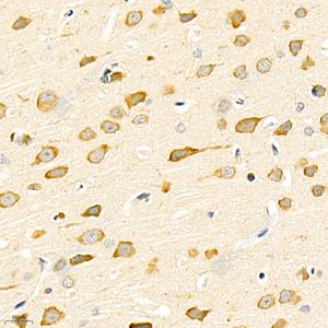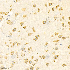IHC检测Ionotropic Glutamate receptor 2蛋白(货号 GB11770). 样品: 大鼠脑, 4%多聚甲醛 (货号G1101) 固定12-24小时. 抗原修复: 柠檬酸抗原修复液(干粉, pH 6.0) (G1201), 98℃, 20分钟. —抗: 1: 3000稀释, 4℃ 孵育过夜. 二抗: HRP标记山羊抗兔IgG (H+L) (货号GB23303), 1: 200稀释, 室温孵育1小时. |