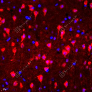 IF检测Ionotropic Glutamate receptor 2蛋白(货号 GB11770)(红色). 样品: 小鼠脑, 4%多聚甲醛 (货号G1101) 固定12-24小时. 抗原修复: Tris-EDTA抗原修复液(pH 9.0) (G1203), 98℃, 20分钟. 封闭: 3% BSA(货号GC305010)的PBS溶液, 室温孵育30分钟. —抗: 1: 500稀释, 4℃ 孵育过夜. 二抗: Cy3标记山羊抗兔IgG (H+L) (货号GB21303), 1: 300稀释, 室温孵育1小时. |