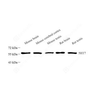 WB检测5HT7 Receptor蛋白(货号 GB113077). 样品: 经RIPA裂解液(货号G2002)处理的蛋白质. 封闭: 封闭: 3%脱脂牛奶(货号GC310001)溶于TBST溶液, 室温孵育1小时. —抗: 1: 1500稀释, 4℃ 孵育过夜. 二抗: HRP标记山羊抗兔IgG (H+L) (货号GB23303), 1: 5000稀释, 室温孵育1小时. |