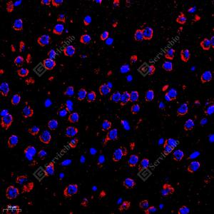 IF检测GLRB蛋白(货号 GB111535)(红色). 样品: 小鼠脑, 4%多聚甲醛 (货号G1101) 固定12-24小时. 抗原修复: Tris-EDTA抗原修复液(pH 9.0) (G1203), 98℃, 20分钟. 封闭: 3% BSA(货号GC305010)的PBS溶液, 室温孵育30分钟. —抗: 1: 500稀释, 4℃ 孵育过夜. 二抗: Cy3标记山羊抗兔IgG (H+L) (货号GB21303), 1: 300稀释, 室温孵育1小时. |