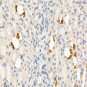 IHC检测Monoamine Oxidase A/MAO-A蛋白(货号 GB112401). 样品: 小鼠肾, 4%多聚甲醛 (货号G1101) 固定12-24小时. 抗原修复: 柠檬酸抗原修复液(干粉, pH 6.0) (G1201), 98℃, 20分钟. —抗: 1: 1500稀释, 4℃ 孵育过夜. 二抗: HRP标记山羊抗兔IgG (H+L) (货号GB23303), 1: 200稀释, 室温孵育1小时. |
