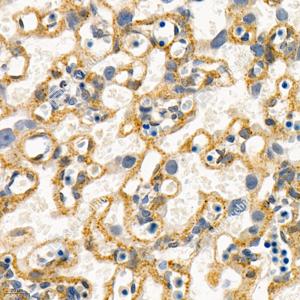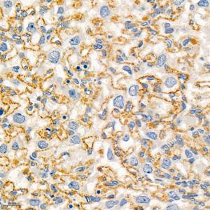 IHC检测Monoamine Oxidase A/MAO-A蛋白(货号 GB112401). 样品: 大鼠胎盘, 4%多聚甲醛 (货号G1101) 固定12-24小时. 抗原修复: 柠檬酸抗原修复液(干粉, pH 6.0) (G1201), 98℃, 20分钟. —抗: 1: 1500稀释, 4℃ 孵育过夜. 二抗: HRP标记山羊抗兔IgG (H+L) (货号GB23303), 1: 200稀释, 室温孵育1小时. |
