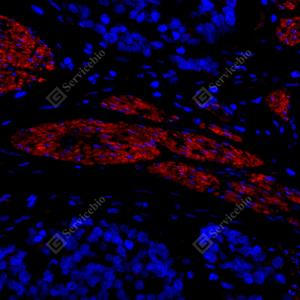 IF检测CPLX2蛋白(货号 GB114465)(红色). 样品: 人胃神经内分泌瘤, 4%多聚甲醛 (货号G1101) 固定12-24小时. 抗原修复: Tris-EDTA抗原修复液(pH 9.0) (G1203), 98℃, 20分钟. 封闭: 3% BSA(货号GC305010)的PBS溶液, 室温孵育30分钟. —抗: 1: 700稀释, 4℃ 孵育过夜. 二抗: Cy3标记山羊抗兔IgG (H+L) (货号GB21303), 1: 300稀释, 室温孵育1小时. |