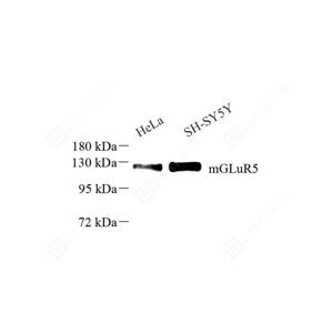 WB检测Metabotropic Glutamate Receptor 5蛋白(货号 GB11746). 样品: 经RIPA裂解液(货号G2002)处理的蛋白质. 封闭: 封闭: 3%脱脂牛奶(货号GC310001)溶于TBST溶液, 室温孵育1小时. —抗: 1: 500稀释, 4℃ 孵育过夜. 二抗: HRP标记山羊抗兔IgG (H+L) (货号GB23303), 1: 5000稀释, 室温孵育1小时. |