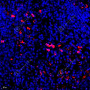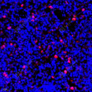 IF检测NGF蛋白(货号 GB111206)(红色). 样品: 大鼠脾, 4%多聚甲醛 (货号G1101) 固定12-24小时. 抗原修复: Tris-EDTA抗原修复液(pH 9.0) (G1203), 98℃, 20分钟. 封闭: 3% BSA(货号GC305010)的PBS溶液, 室温孵育30分钟. —抗: 1: 1100稀释, 4℃ 孵育过夜. 二抗: Cy3标记山羊抗兔IgG (H+L) (货号GB21303), 1: 300稀释, 室温孵育1小时. |
