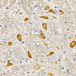 IHC检测BLBP蛋白(货号 GB121213). 样品: 人脑胶质瘤, 4%多聚甲醛 (货号G1101) 固定12-24小时. 抗原修复: 柠檬酸抗原修复液(干粉, pH 6.0) (G1201), 高压锅均匀喷气计时2分钟. —抗: 1: 4000稀释, 4℃ 孵育过夜. 二抗: HRP标记山羊抗小鼠IgG (H+L) (货号GB23301), 1: 200稀释, 室温孵育1小时. |