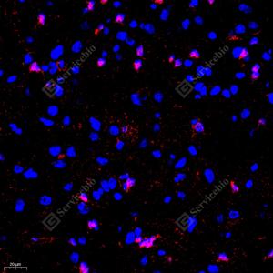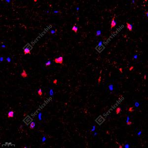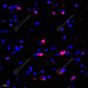 IF检测BLBP蛋白(货号 GB121213)(红色). 样品: 大鼠脊髓, 4%多聚甲醛 (货号G1101) 固定12-24小时. 抗原修复: 柠檬酸抗原修复液(干粉, pH 6.0) (G1201), 高压锅均匀喷气计时2分钟. 封闭: 3% BSA(货号GC305010)的PBS溶液, 室温孵育30分钟. —抗: 1: 4000稀释, 4℃ 孵育过夜. 二抗: Cy3标记山羊抗小鼠IgG (H+L) (货号GB21301), 1: 300稀释, 室温孵育1小时. |