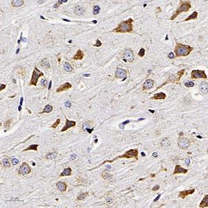 IHC检测GDNF蛋白(货号 GB11403). 样品: 大鼠脑, 4%多聚甲醛 (货号G1101) 固定12-24小时. 抗原修复: 柠檬酸抗原修复液(干粉, pH 6.0) (G1201), 98℃, 20分钟. —抗: 1: 200稀释, 4℃ 孵育过夜. 二抗: HRP标记山羊抗兔IgG (H+L) (货号GB23303), 1: 200稀释, 室温孵育1小时. |
