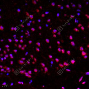 IF检测GDNF蛋白(货号 GB11403)(红色). 样品: 小鼠脑, 4%多聚甲醛 (货号G1101) 固定12-24小时. 抗原修复: Tris-EDTA抗原修复液(pH 9.0) (G1203), 98℃, 20分钟. 封闭: 3% BSA(货号GC305010)的PBS溶液, 室温孵育30分钟. —抗: 1: 200稀释, 4℃ 孵育过夜. 二抗: Cy3标记山羊抗兔IgG (H+L) (货号GB21303), 1: 300稀释, 室温孵育1小时. |