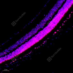 IF检测GDNF蛋白(货号 GB11403)(红色). 样品: 小鼠眼球, 4%多聚甲醛 (货号G1101) 固定12-24小时. 抗原修复: Tris-EDTA抗原修复液(pH 9.0) (G1203), 98℃, 20分钟. 封闭: 3% BSA(货号GC305010)的PBS溶液, 室温孵育30分钟. —抗: 1: 200稀释, 4℃ 孵育过夜. 二抗: Cy3标记山羊抗兔IgG (H+L) (货号GB21303), 1: 300稀释, 室温孵育1小时. |