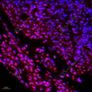 IF检测GDNF蛋白(货号 GB11403)(红色). 样品: 小鼠卵巢, 4%多聚甲醛 (货号G1101) 固定12-24小时. 抗原修复: Tris-EDTA抗原修复液(pH 9.0) (G1203), 98℃, 20分钟. 封闭: 3% BSA(货号GC305010)的PBS溶液, 室温孵育30分钟. —抗: 1: 200稀释, 4℃ 孵育过夜. 二抗: Cy3标记山羊抗兔IgG (H+L) (货号GB21303), 1: 300稀释, 室温孵育1小时. |