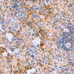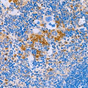 IHC检测AMF蛋白(货号 GB111160). 样品: 大鼠脾, 4%多聚甲醛 (货号G1101) 固定12-24小时. 抗原修复: 柠檬酸抗原修复液(干粉, pH 6.0) (G1201), 98℃, 20分钟. —抗: 1: 500稀释, 4℃ 孵育过夜. 二抗: HRP标记山羊抗兔IgG (H+L) (货号GB23303), 1: 200稀释, 室温孵育1小时. |
