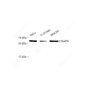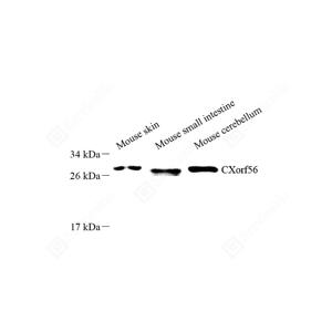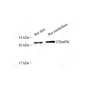 WB检测CXorf56蛋白(货号 GB111878). 样品: 经RIPA裂解液(货号G2002)处理的蛋白质. 封闭: 封闭: 3%脱脂牛奶(货号GC310001)溶于TBST溶液, 室温孵育1小时. —抗: 1: 250稀释, 4℃ 孵育过夜. 二抗: HRP标记山羊抗兔IgG (H+L) (货号GB23303), 1: 5000稀释, 室温孵育1小时. |