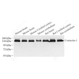 WB检测Contactin 1蛋白(货号 GB11712). 样品: 经RIPA裂解液(货号G2002)处理的蛋白质. 封闭: 3%脱脂牛奶(货号GC310001)溶于TBST溶液, 室温孵育1小时. —抗: 1: 1000稀释, 4℃ 孵育过夜. 二抗: HRP标记山羊抗兔IgG (H+L) (货号GB23303), 1: 5000稀释, 室温孵育1小时. |