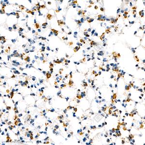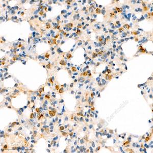 | IHC检测DEGA蛋白(货号 GB111307). 样品: 小鼠肺, 4%多聚甲醛 (货号G1101) 固定12-24小时. 抗原修复: 柠檬酸抗原修复液(干粉, pH 6.0) (G1201), 98℃, 20分钟. —抗: 1: 1300稀释, 4℃ 孵育过夜. 二抗: HRP标记山羊抗兔IgG (H+L) (货号GB23303), 1: 200稀释, 室温孵育1小时. |