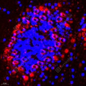 | IF检测DEGA蛋白(货号 GB111307)(红色). 样品: 小鼠小脑, 4%多聚甲醛 (货号G1101) 固定12-24小时. 抗原修复: Tris-EDTA抗原修复液(pH 9.0) (G1203), 98℃, 20分钟. 封闭: 3% BSA(货号GC305010)的PBS溶液, 室温孵育30分钟. —抗: 1: 1300稀释, 4℃ 孵育过夜. 二抗: Cy3标记山羊抗兔IgG (H+L) (货号GB21303), 1: 300稀释, 室温孵育1小时. |