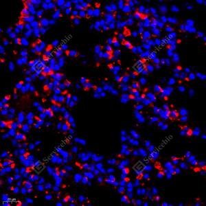 | IF检测DEGA蛋白(货号 GB111307)(红色). 样品: 小鼠肺, 4%多聚甲醛 (货号G1101) 固定12-24小时. 抗原修复: Tris-EDTA抗原修复液(pH 9.0) (G1203), 98℃, 20分钟. 封闭: 3% BSA(货号GC305010)的PBS溶液, 室温孵育30分钟. —抗: 1: 1300稀释, 4℃ 孵育过夜. 二抗: Cy3标记山羊抗兔IgG (H+L) (货号GB21303), 1: 300稀释, 室温孵育1小时. |