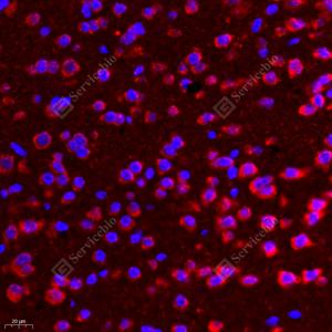 | IF检测DEGA蛋白(货号 GB111307)(红色). 样品: 大鼠脑, 4%多聚甲醛 (货号G1101) 固定12-24小时. 抗原修复: Tris-EDTA抗原修复液(pH 9.0) (G1203), 98℃, 20分钟. 封闭: 3% BSA(货号GC305010)的PBS溶液, 室温孵育30分钟. —抗: 1: 1300稀释, 4℃ 孵育过夜. 二抗: Cy3标记山羊抗兔IgG (H+L) (货号GB21303), 1: 300稀释, 室温孵育1小时. |