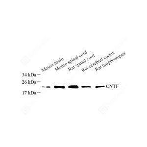 WB检测CNTF蛋白(货号 GB11705). 样品: 经RIPA裂解液(货号G2002)处理的蛋白质. 封闭: 封闭: 3%脱脂牛奶(货号GC310001)溶于TBST溶液, 室温孵育1小时. —抗: 1: 500稀释, 4℃ 孵育过夜. 二抗: HRP标记山羊抗兔IgG (H+L) (货号GB23303), 1: 5000稀释, 室温孵育1小时. |